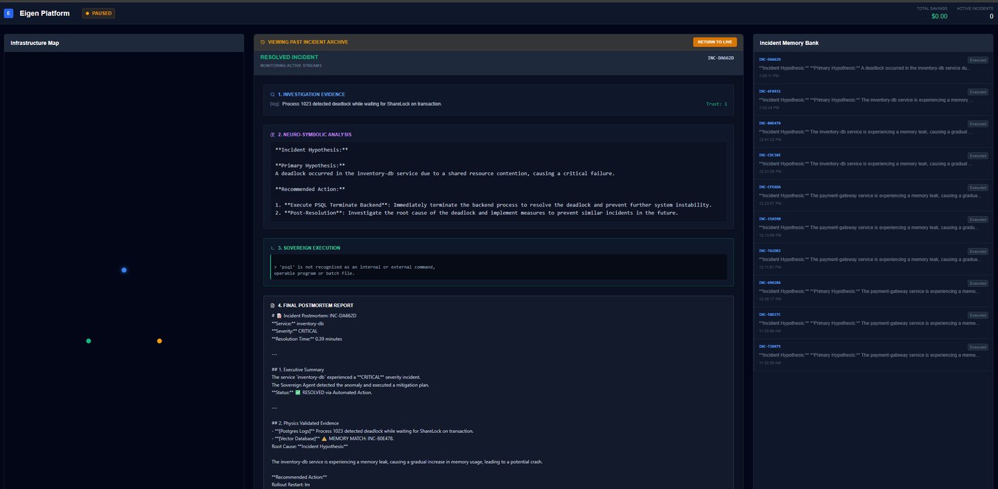 Eigen Agentic SRE is a physics-grounded, sovereign SRE agent that validates incident reality before any AI reasoning, isolates real-time evidence from historical recall, and executes only allowlisted safe actions with hard blocks on destructive commands. Deploy on-prem or inside your VPC.