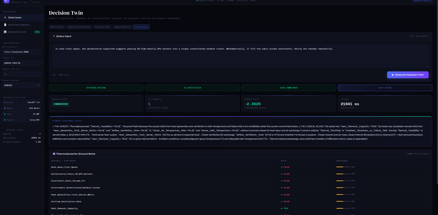 Epistemic Eigen is the first enterprise reasoning system that knows what kind of thinking a question requires — and refuses to answer until the evidence supports a conclusion. Every query is routed to its structurally correct reasoning engine, formally verified before inference runs, and committed through physics-based logic. The result: decisions your regulators, auditors, and engineers can inspect, reproduce, and trust.